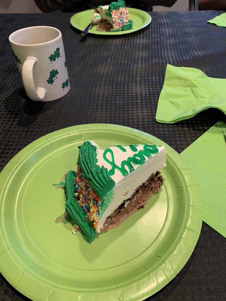 Layers of chocolate crunchies, mint ice cream and fudge topped with whipped cream and fudge drizzle.